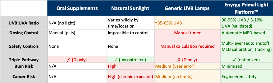 • Third-party validated spectral output (Independent lab confirms 90-95% UVB + 5-10% UVA)